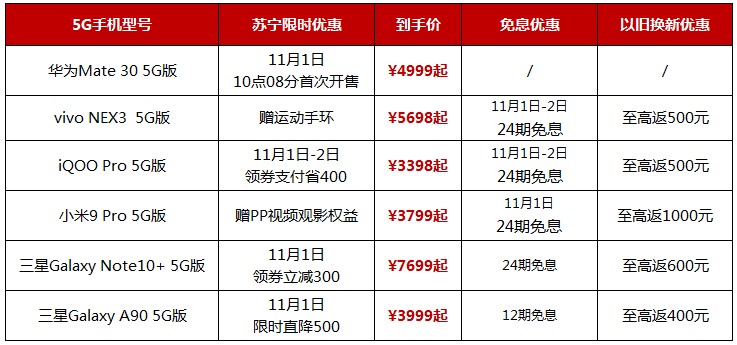 目前正值雙十一節點,記者從蘇寧易購獲悉,5G套餐公佈後,5G手機產品將迎來首次降價,降價力度在300元-500元不等,同時,針對5G手機,蘇寧易購推出以舊換新補貼,最高補貼力度達到1000元,對消費者來説,用上5G手機的成本降低。