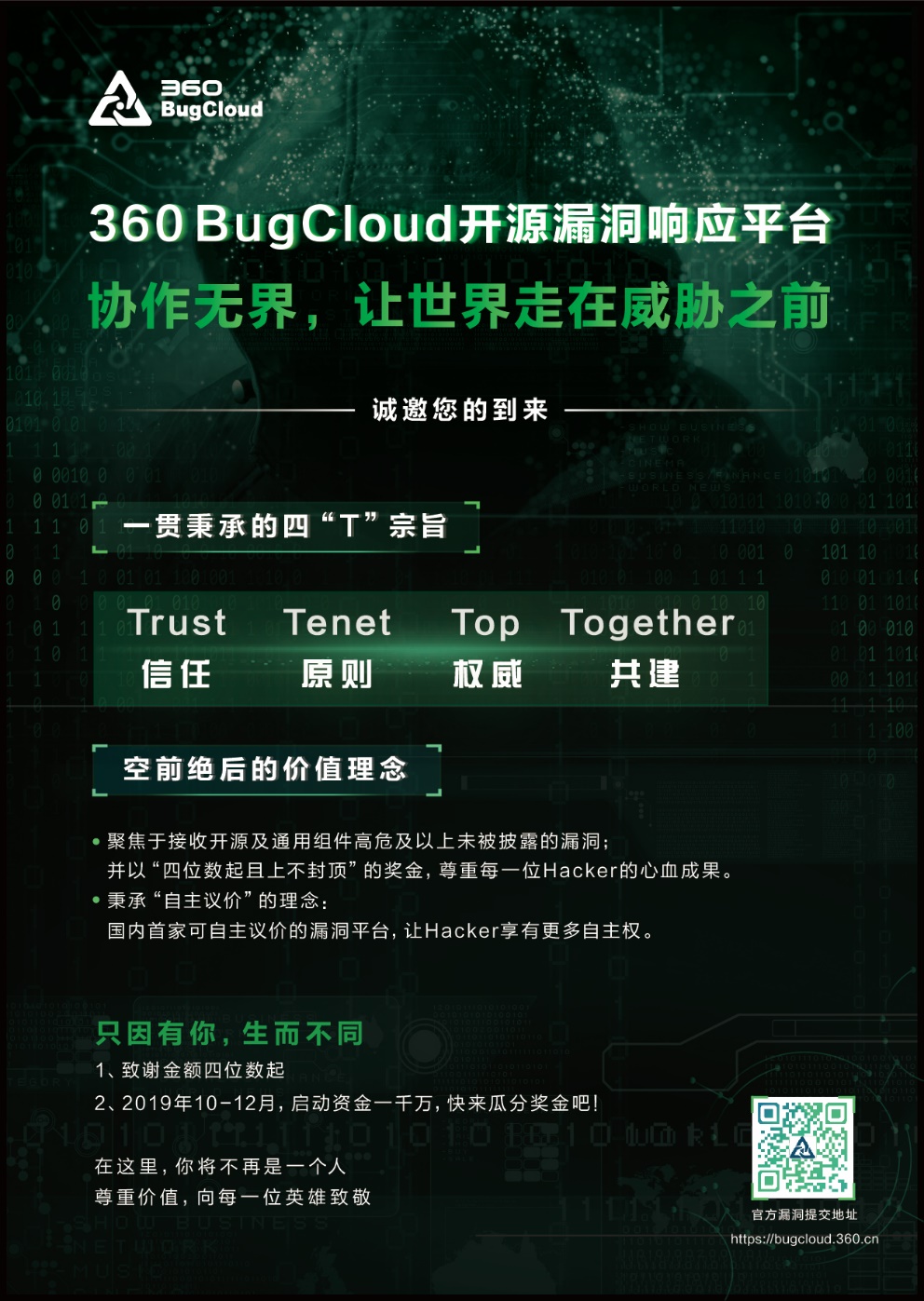 360BugCloud致力於維護開源通用軟件安全,力爭打造以技術為驅動、以安全專家為核心,針對開源通用型高危漏洞進行安全研究及應急響應的組織與平台。