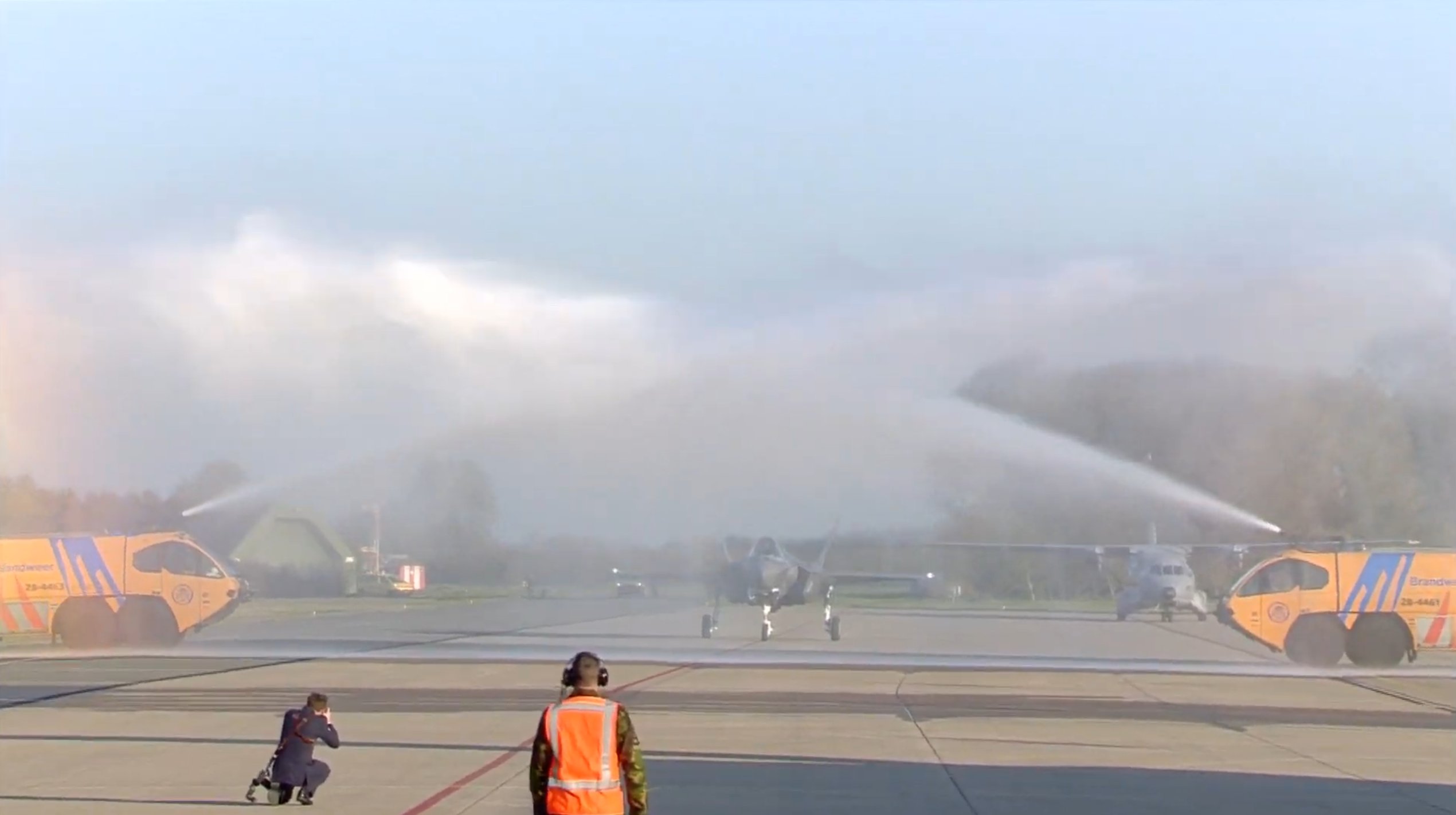 按照國際慣例,荷蘭空軍出動兩輛機場消防車,以“水門”的方式迎接抵達該基地的首架F-35A戰鬥機。當這架編號為F-009的F-35A戰鬥機緩緩駛過兩輛消防車中間時,兩車按照計劃噴水迎接。不過噴水過程中出現了意外,一輛消防車並沒有按照原計劃噴出自來水,而是噴灑了消防泡沫,這讓荷蘭空軍的首架F-35A戰鬥機瞬間“被糊一臉”。
