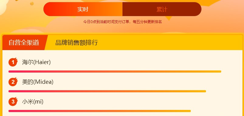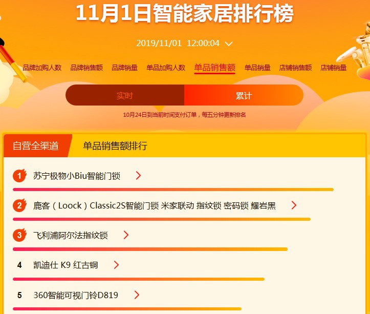 11月1日零點至12點,海爾、美的、小米位列蘇寧悟空排行榜家電整體品牌銷售額前三位。松下智能馬桶蓋EKS09銷售突破1萬台,創維超高清電視55M7S銷售突破5萬台,海爾智能保鮮冰箱BCD-331WDGQ訂單增長超400%,美的空調智弧系列銷售破4.5萬套,壁掛新風同比增長1102%。