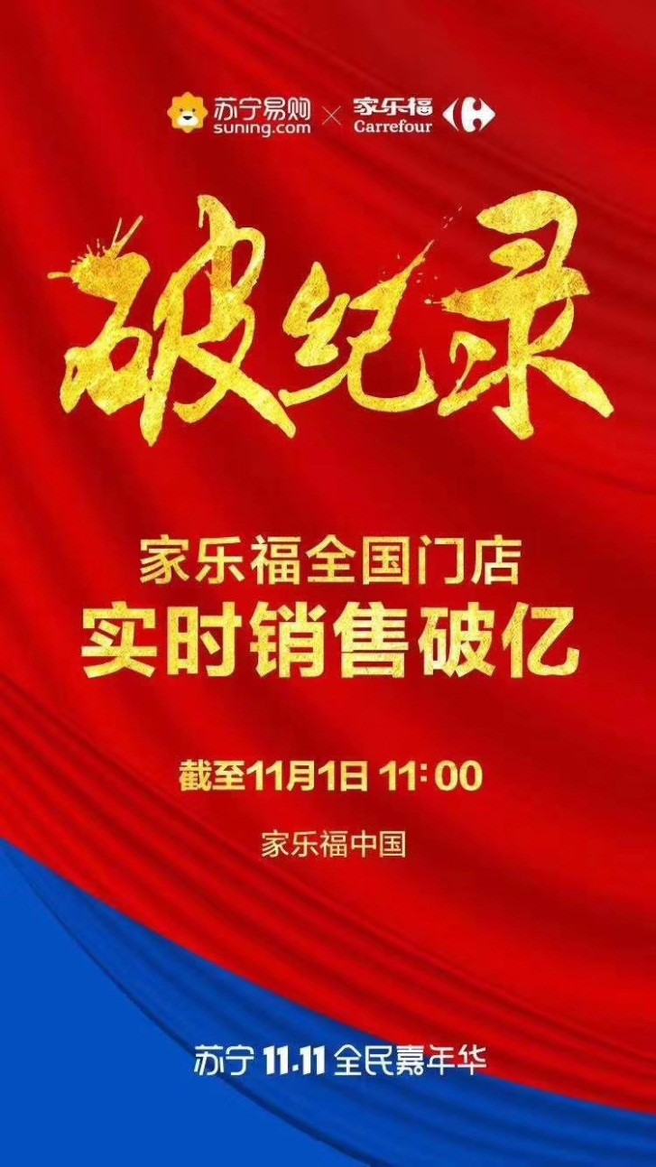 首次參加蘇寧雙十一的家樂福,210家門店從11月1日早上8點開始,至11點時銷售已經破億。