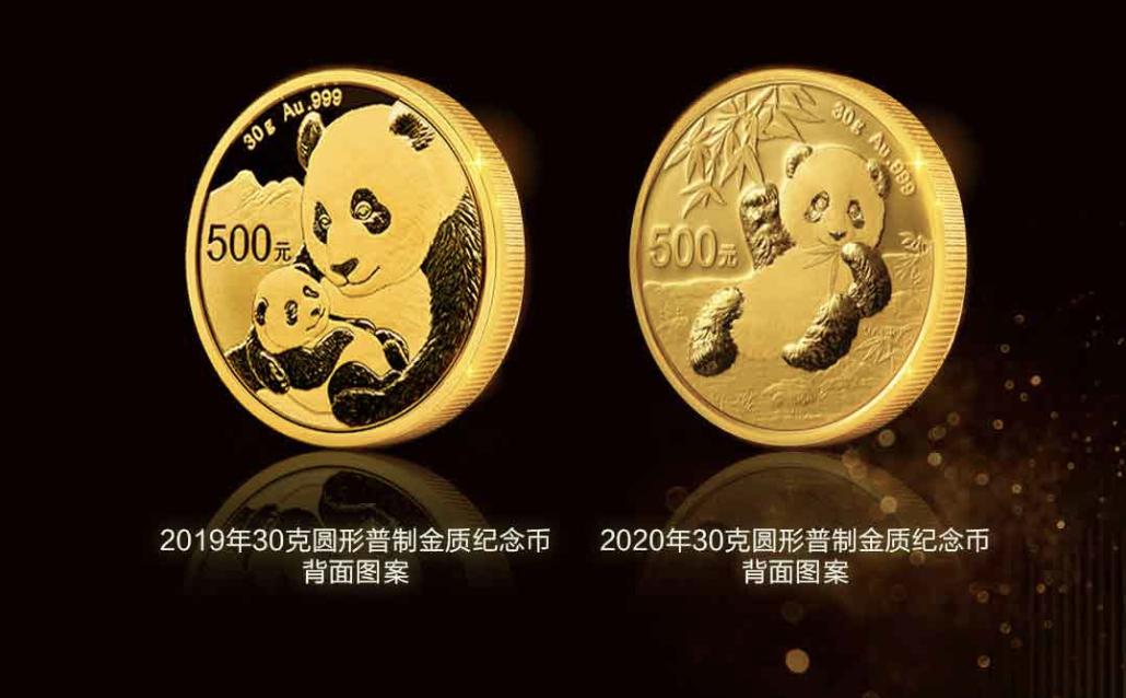 圖案方面,2020版熊貓幣的圖案是2019版的延續。2019年的圖案是母子熊貓,小熊貓躺在媽媽懷抱,而2020年的則是一隻長大的小熊貓,在草地調皮吃竹子玩要,一手抓住頭頂竹子,一手往嘴裏送竹葉,神情憨態可掬。
