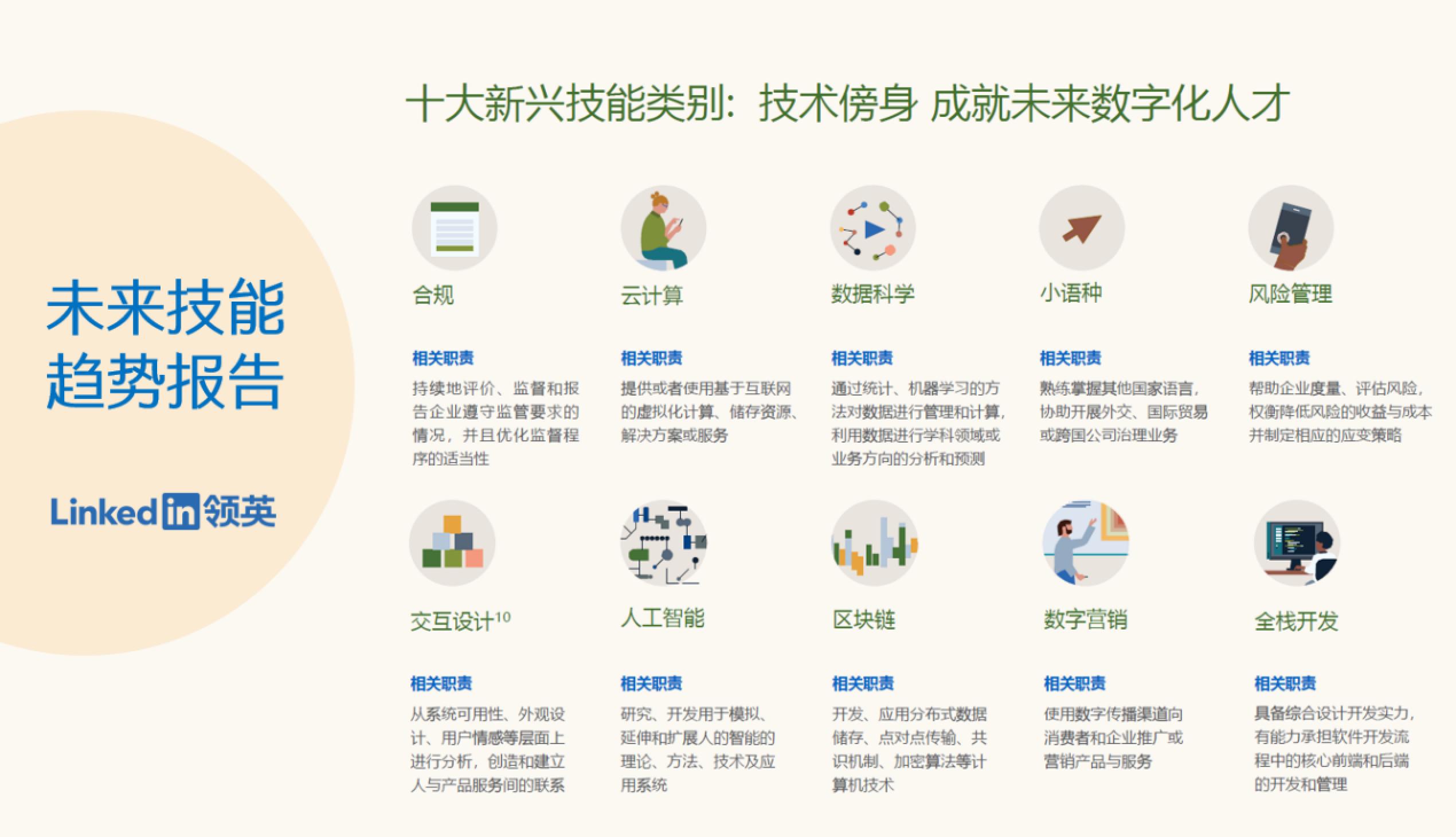 會上,領英發布了《中國未來技能趨勢報告》,以幫助中國企業瞭解未來新興人才技能發展方向與崗位演變,從容應對數字化轉型及產業升級的人才挑戰。《報告》數據顯示,2019年中國人才掌握的技能中,增長最快的十大新興技能分別為:合規、雲計算、數據科學、小語種、風險管理、交互設計、人工智能、區塊鏈、數字營銷、全棧開發,其中全棧開發、人工智能、區塊鏈技能增長率位列前三,小語種、合規等非技術技能躋身前十。