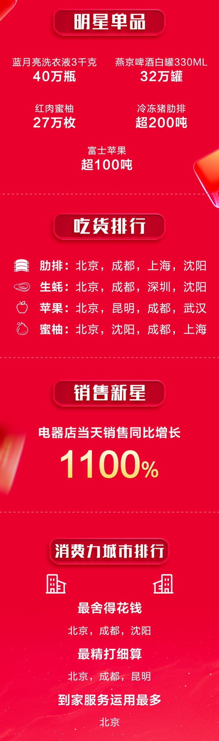 除了生鮮,牛奶、洗衣液等商超暢銷品類也在開門紅當天取得傲人的戰果。