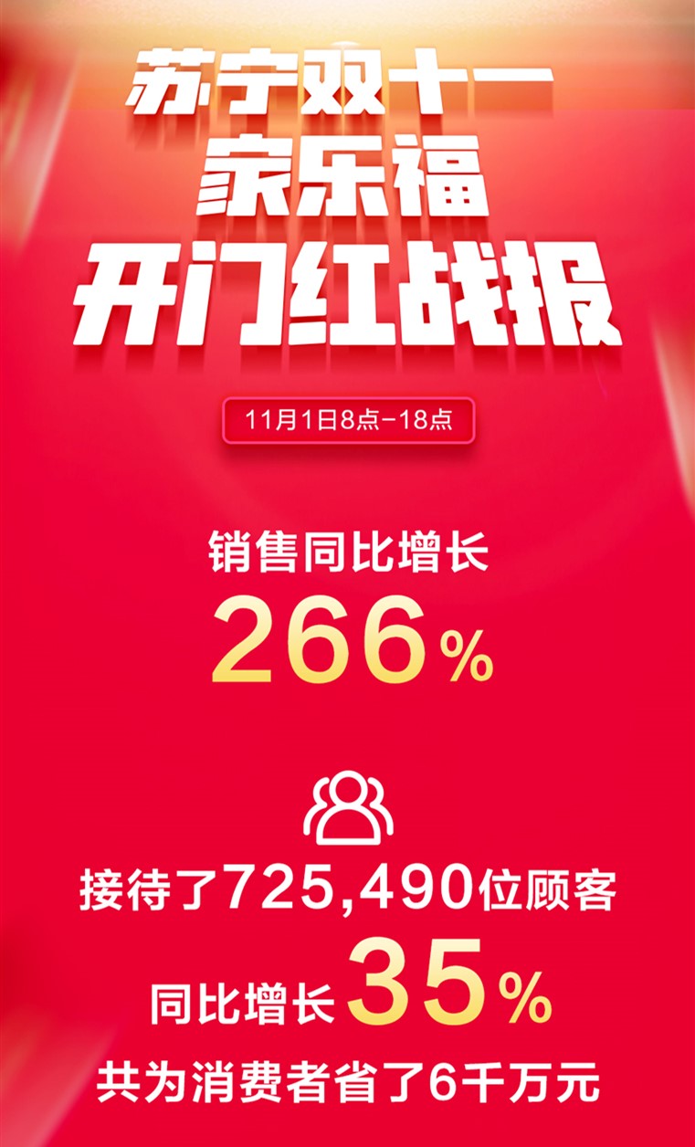 首次迎來蘇寧雙十一開門紅,家樂福中國創下新紀錄。11月1日8點至11點,全國210家門店銷售破億。截至當天18點,全國到店人次超72萬,同比增長35%,累計銷售同比增長266%,共為消費者省下6千萬元。