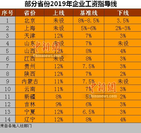 據中新網記者不完全統計,截至11月2日,至少已有北京、上海、天津、山東、山西、江西、貴州、陝西、內蒙古、雲南、新疆、吉林、寧夏、遼寧等14個省區市公佈了2019年企業工資指導線。