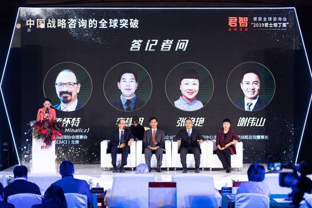 在11月4日於北京召開的中國戰略諮詢的全球突破”暨君智榮獲全球諮詢業“2019君士坦丁獎”新聞發佈會上,國際管理諮詢協會理事會(ICMCI)主席德懷特(Dwight Mihalicz)在發佈會上表示:“ICMCI旨在將君士坦丁獎打造成為諮詢領域的奧斯卡獎。君士坦丁獎是對全球各個國家管理諮詢成果在國際層面上的評價。君智的方法論創新融合了西方經典理論及東方智慧,幫助企業在全球市場中獲得更大的成功,值得世界其他諮詢同行借鑑學習。”