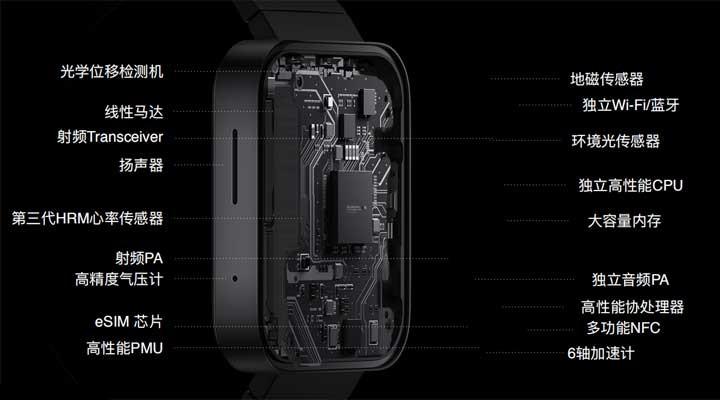 此次發佈的小米手錶主打“一款真正的智能手錶“,在性能配置、外觀工藝均為旗艦級水準,堪稱腕上的“智能手機”。小米手錶採用1.78英寸AMOLED方形高清屏,四曲面玻璃鏡面,全球首發高通驍龍3100 4G版,能夠獨立連接Wi-Fi、藍牙耳機,配備獨立揚聲器、多功能NFC以及線性馬達。此外,小米手錶提供了更加專業的運動健康管理,內置六軸傳感器、第三代HRM心率傳感器,配合三大衞星定位系統,以及指南針、氣壓計,能夠支持十大專業運動模式,並能全方面監測睡眠、壓力值、心率、身體能量檢測等健康數據。同時,小米手錶內置eSIM模擬芯片,不用插卡也能獨立通話、上網,支持一號雙終端和獨立號碼兩種eSIM方案。