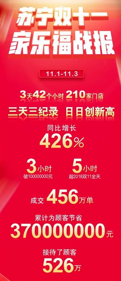 3小時破億,5小時超2018年雙十一全天,3天銷售同比增長426%,首戰蘇寧雙十一的家樂福碩果累累,開門紅三天創造了三個紀錄,累計為526萬人次的消費者服務並節省3億7千萬元,三天十個億的目標也提前完成。