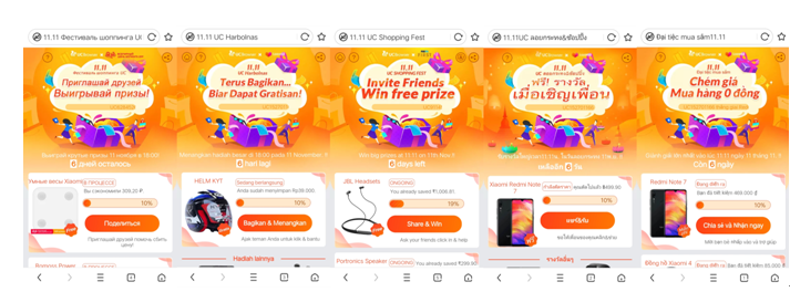 不僅在端內發放海量電商平台商品優惠券,UC還在五國市場同期上線了“全民砍價”和“雙11錦鯉“的新玩法。一系列端內活動為用户提供好玩又實惠的信息服務及購物體驗。