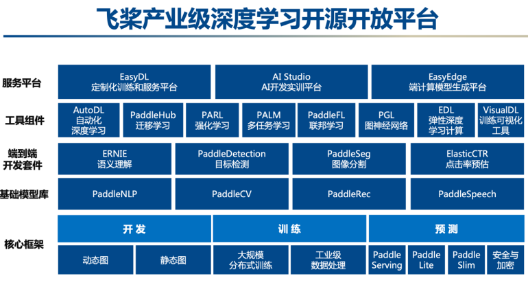 底層的芯片和上層的應用之間,還需要操作系統承接。在智能時代,深度學習框架向下對接硬件、芯片,向上承接各種業務模型、行業應用,起到承上啓下的作用,是“智能時代的操作系統”。百度自主可控的飛槳深度學習 平台,集深度學習訓練和預測框架、模型庫、開發套件、工具組件和服務平台等為一體,是功能完備、全面開源開放的產業級深度學習 平台。飛槳平台核心技術領先,具備開發便捷的產業級深度學習框架、超大規模深度學習模型訓練技術、多端多平台部署的高性能推理引擎、開源開放覆蓋多領域的產業級模型庫四大領先技術。