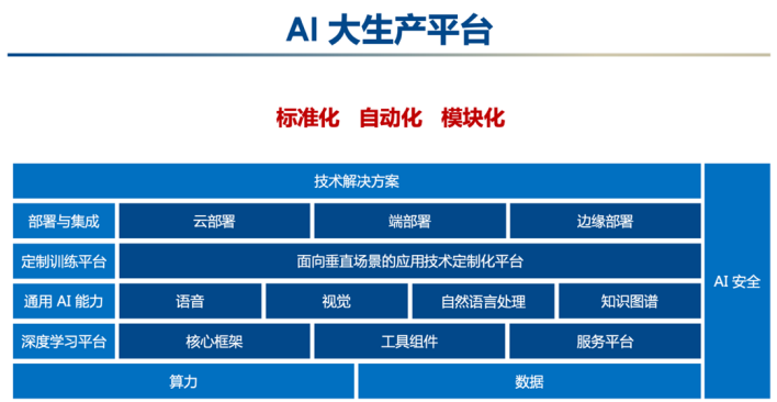 什麼是“軟硬一體AI大生產平台”?王海峯介紹,在基礎算力和數據的支撐下,百度大腦以飛槳深度學習 平台為基礎技術底座,打通了人工智能產業化應用落地相關的全部流程,包括深度學習 平台、通用AI能力、定製化訓練平台、部署與集成,以及應用的技術解決方案,同時有完整的AI安全體系保障,實現了AI技術的標準化、自動化、模塊化。