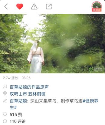 但“百草姑娘”想在快手(快手ID:1431735362)做點不一樣的。“東北不只有冰天雪地,豬肉燉粉條,還有那麼多野生藥材值得被發現。”打反差是“百草姑娘”拍快手的新思路,“我覺得這樣才更能展現出東北的豐富多彩”。