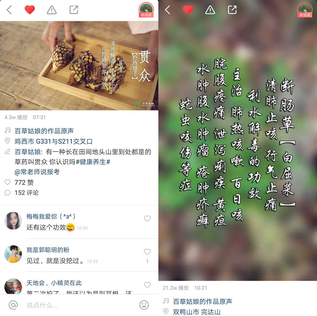 對於常虹以及山裏生活的人而言,自小生活於此,他們早已對漫山遍野的珍稀草藥如數家珍,但大山外的人對此卻知之甚少。“你別看有些植物長得不起眼,作用可大着呢,最關鍵的是到處都有。”在快手分享家鄉特產美景,同時讓老鐵們身臨其境瞭解中草藥知識,“原來寶貝就在我們身邊啊”,“東北,真的跟想象中不太一樣”,“東北不僅地大物博,而且人才輩出啊,加油百草姑娘”……