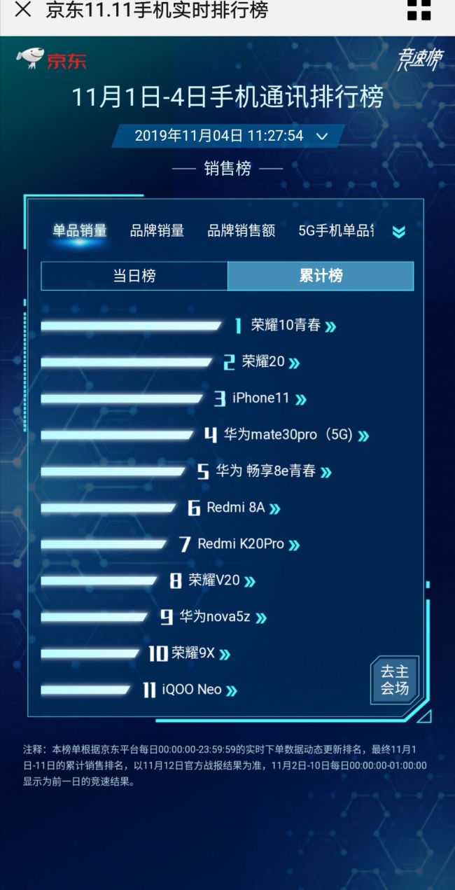 從雙十一首戰雙冠等戰績方面來看,也證實榮耀20系列的真香特質。雙十一開戰當天,榮耀20就獲得了天貓手機品類2000-3000元價位段銷量&銷售額雙冠軍,以及京東手機品類2000-3000元價位段單品銷量冠軍。與此同時,11.1-11.4,榮耀20也取得了京東手機品類單品銷量累計排行榜的第二位,力壓iPhone11,看來榮耀20系列手機才是今年的真香機。