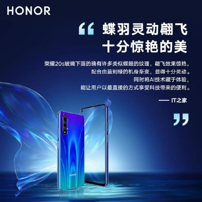 不僅拍照能力超強,榮耀20系列在在顏值外觀方面也深深吸引着年輕人的目光。榮耀20 系列繼承了榮耀數字系列的時尚基因,榮耀20PRO推出了“藍水翡翠”和“幻夜星河”和“冰島幻境”三大全新潮流配色,在手機背殼產生純淨通透且深邃的立體鏡面效果,形成空間透視感。榮耀20S以蝴蝶為靈感,在後蓋玻璃上呈現出“蝶羽紋理”光影效果。遠遠望去,猶如一隻蝴蝶在手機背部翩翩起舞,極為時尚。