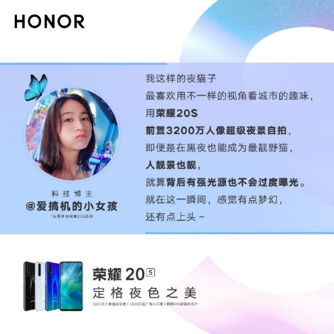 而有着“榮耀年度最強自拍手機”之稱的榮耀20S則搭載了3200萬人像超級夜景技術,突破性地將AIS人像超級夜景技術應用於前置,帶來了“人像超級夜景自拍模式”,讓夜景自拍實現 “夜美人更美,景亮人更靚”的效果。