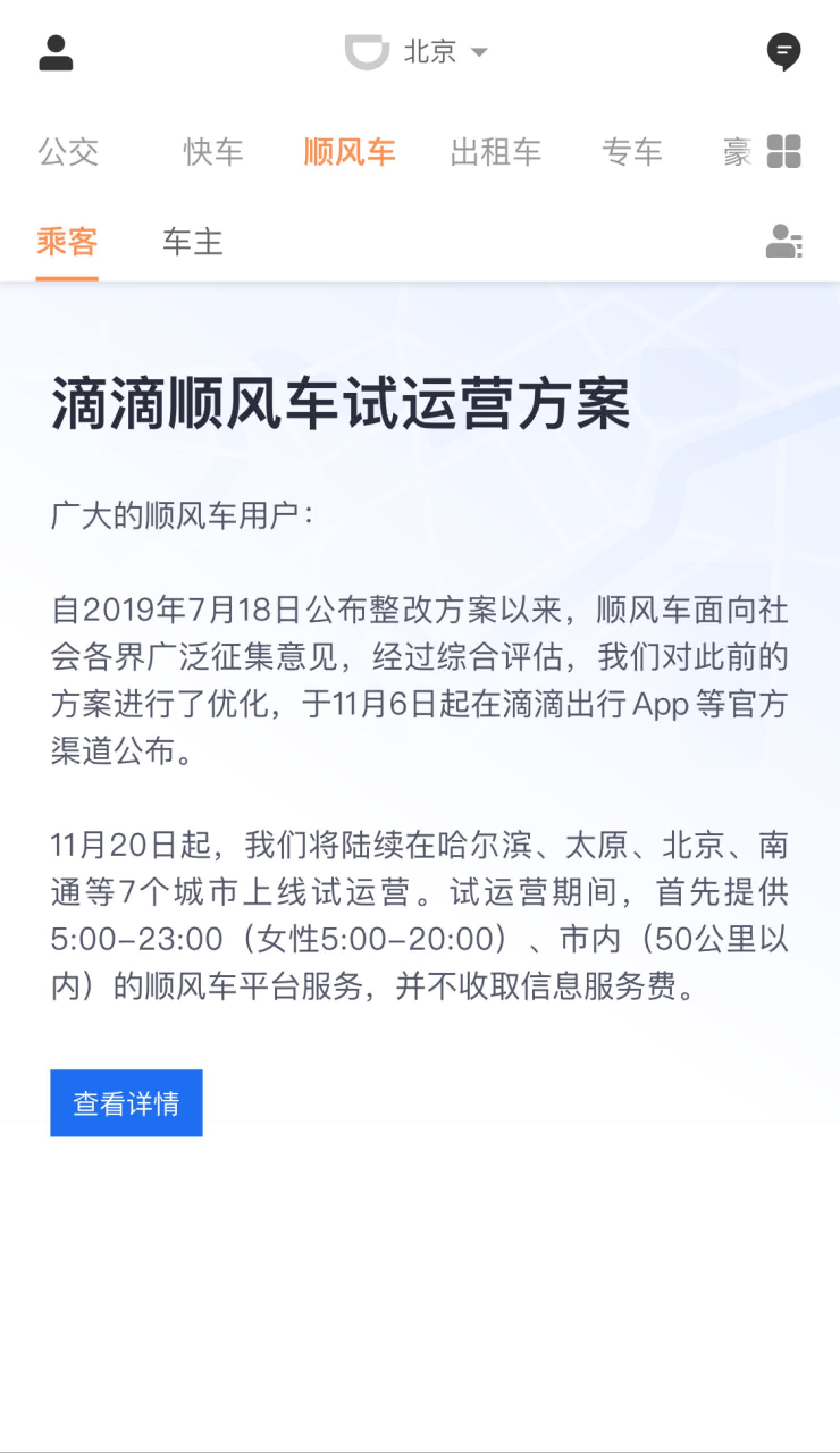 7月18日以來,順風車陸續公佈了整改方案、上線公眾評議會、召開用户懇談會,廣泛向社會徵集意見。我們認真梳理了來自車主、乘客和熱心網友的很多建議和意見,經過綜合評估,對產品方案不斷優化迭代,並邀請專家評審、報送交通運輸新業態協同監管部際聯席會議辦公室。最新產品方案以及首批試運營城市名單于11月6日起在滴滴出行App等官方渠道公佈。