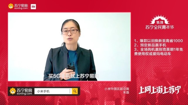 與此同時,小米自然也是不甘示弱,雷軍剛剛發佈備受關注的1億像素手機新品——小米CC9 Pro,同時還有小米9 Pro 5G手機等新品在雙十一爆發,小米中國區副總裁朱磊在視頻中表示,雙十一買5G手機就上蘇寧易購。