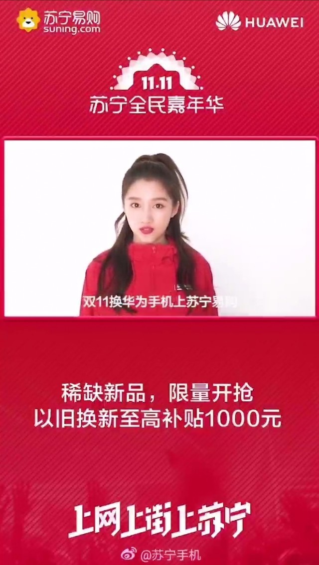 同樣邀請代言人傾情站台的還有華為,作為目前炙手可熱的手機品牌,華為也在雙十一節點,邀請代言人關曉彤發聲,雙十一換華為手機上蘇寧易購,以舊換新省更多。據悉雙十一期間,蘇寧易購以舊換新購買華為手機,最高補貼可達到1000元。