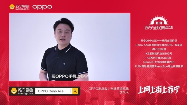 OPPO副總裁、全球營銷總裁沈義人表示,雙十一買OPPO手機上蘇寧,OPPO Ace系列新機備貨充足,同時蘇寧購機立減200元等優惠。