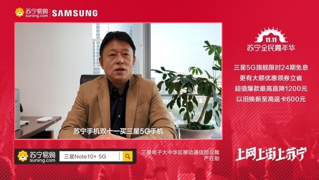 三星電子大中華區移動通信部總裁嚴在勳也力挺蘇寧易購,併為三星5G手機代言。眼下5G大潮滾滾而來,三星note 10+5G手機在全球熱賣,雙十一期間,蘇寧買三星5G手機24期免息,還有超值爆款最高直降1200元,以舊換新補貼600等多重優惠。