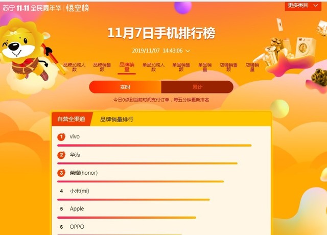 目前雙十一已經進入臨門一腳的節奏,各大手機品牌爭相發力,蘇寧的雙十一悟空榜也成為了檢驗品牌即時戰績的“晴雨表”,截至11月7日當天,蘇寧悟空榜手機銷量即時榜單,vivo、華為、榮耀、小米、蘋果、OPPO位列前六名,國產品牌強勢崛起,最終戰況如何,值得關注。