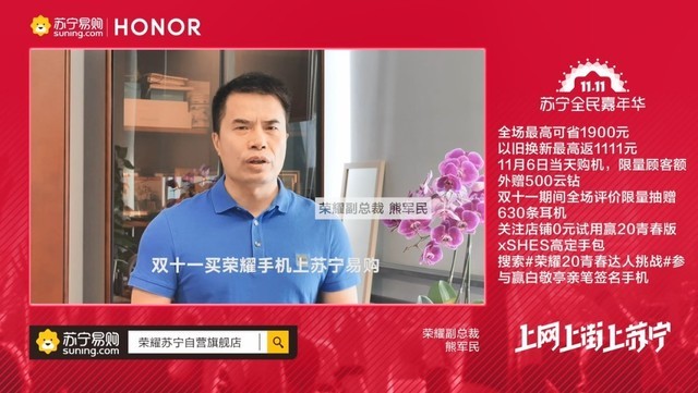 同樣表示“雙十一買手機上蘇寧”的手機業內大佬,還有榮耀副總裁熊軍民,榮耀手機今年雙十一在蘇寧易購拿出了最大的力度,全場最高可省1900元,同時以舊換新最高返1111元等大力度活動,也不斷刺激用户,雙十一在蘇寧入手榮耀手機。