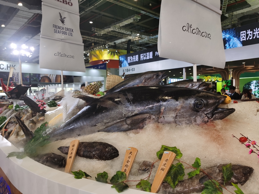 另一邊喧鬧音樂,也吸引了記者的目光,來自西班牙的表演者正在隨歌跳起勁爆的多弗拉明戈舞蹈,而這片展台堪稱是整個展館的最核心區域,西班牙的紅酒、火腿,阿根廷的牛肉。更有新鮮水產、牛羊肉、大米、麪粉、糖果等等品類之豐富不亞於農貿市場。這片巨大的展區屬於光明食品集團打造的“The smart chain全球食品集成分銷平台。”最為奪人眼球的莫過於中央的金槍魚方陣,最大的藍鰭金槍魚重達250公斤。