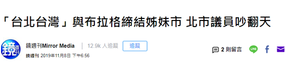 【環球網綜合報道】台北市政府11月8日在市議會提案,稱要與捷克布拉格締結友好城市關係。據台媒報道,當得知台北市政府計劃使用“台灣台北”(“THE CITY OF TAIPEI, TAIWAN”)名義後,市議員“亂成一團”,讓此案被暫時擱置。台灣“聯合新聞網”報道提及,現在如果暫時擱置,此案未來變數很大。