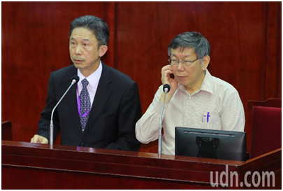 柯文哲(右)與周台竹(左)參加台北市議會(圖片來源:台媒)