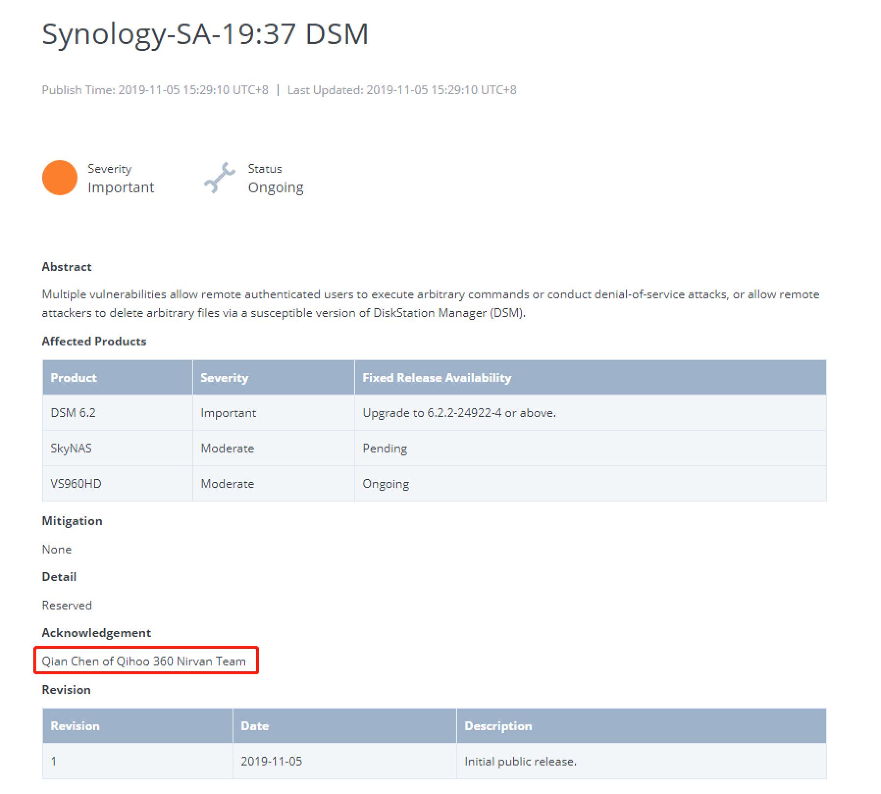 在發現這些漏洞後,陳千已第一時間通知了羣暉公司。11月5日,羣暉公司在官網公告已修復了部分漏洞。