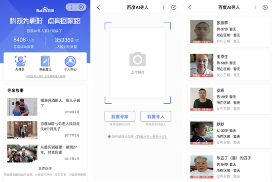 據悉,“百度AI尋人”是百度於2016年底推出的一項AI公益服務,百度與民政部、寶貝回家等專業機構展開合作,用AI人臉識別技術幫助走失者回家。剛剛發佈的財報提到,在2019年第三季度,百度AI已經幫助7900多個走失者與家庭團圓。