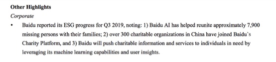 11月7日,百度(Nasdaq:BIDU)公佈了2019年第三季度未經審計的財務報告。財報顯示,百度實現營收281億元人民幣,歸屬百度的淨利潤達到44億元人民幣,遠超華爾街預期。不同尋常的是,這份財報提及百度在公益領域的表現,其中百度AI尋人數據值得外界關注。