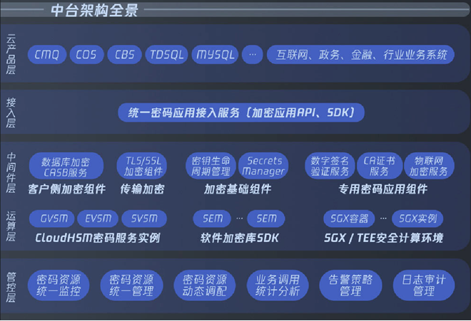 為幫助行業客户解決數據安全問題,護航產業安全發展,騰訊安全基於20年來騰訊自身數據保護的經驗,和行業領先的攻防技術積累,推出了“雲數據安全中台”,打造端到端的雲數據全生命週期安全體系,以數據加密軟硬件系統(CloudHSM/SEM)、密鑰管理系統(KMS)以及憑據管理系統(SecretsManager)三大能力為核心,將密碼運算、密碼技術及密碼產品以服務化、組件化的方式輸出,並無縫集成至騰訊雲產品中,實現從數據獲取、事務處理及檢索、數據分析與服務,數據訪問與消費過程中的安全防護。