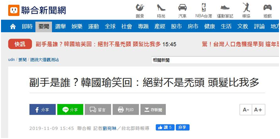 對於副手人選,韓國瑜9日表示,過兩天大家就會知道。據《聯合報》報道,他笑着説,自己是禿頭,副手絕對不是禿頭,頭髮一定比自己多。而當媒體繼續追問是不是“前行政院長”張善政時,韓國瑜再度表態,副手不是禿頭。