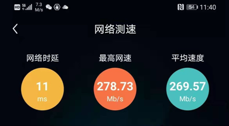 記者通過測速工具“網絡測速大師”在國貿商圈親測發現,當5G信號通暢的情況下,網絡時延僅為11ms,瞬時最高網速能夠達到278.73Mb/s,平均網速為269.57Mb/s。而利用Speedtest測試軟件所得的結果則為時延8ms,抖動1ms,下載網速488Mbps,上傳網絡51.2Mbps,測試效果更為精準。
