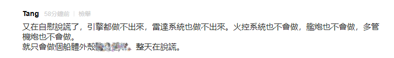 更有網友接連諷刺:又在自慰説謊了,引擎都做不出來,雷達系統也做不出來。火控系統也不會做,艦炮也不會做,多管機炮也不會做,就只會做個船體外殼,整天在説謊;只是給民進黨多一個貪污的管道而已。