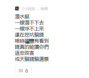 還有網友直接指出:不過只是錢入它人的口袋;潛水艇,一艘潛不下去,一艘浮不上來,還在挖坑騙錢,啥時有看到,錢真的能讓你們這些政客成天騙錢騙選票。
