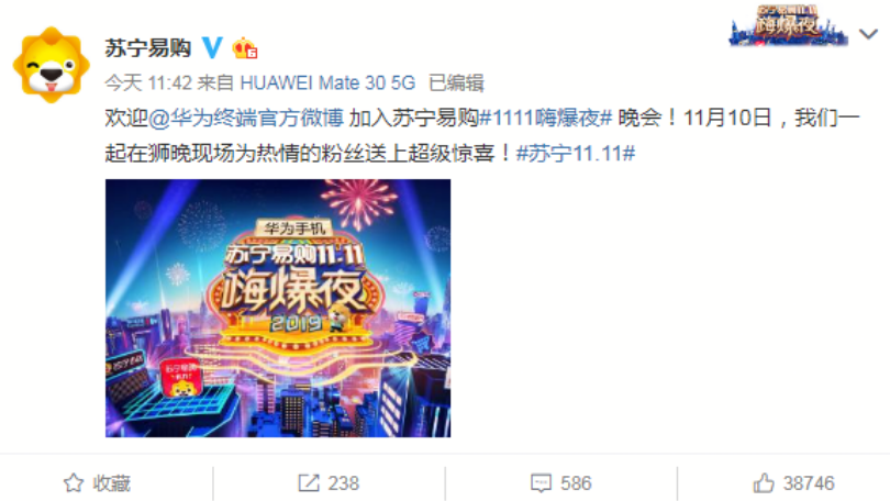 11月8日,蘇寧易購和華為聯合官宣,華為手機成為湖南衞視蘇寧易購11.11嗨爆夜總冠名,將一起在獅晚現場,為熱情的粉絲送上超級驚喜,雙十一開展深度合作,共同引爆嗨爆夜狂歡。