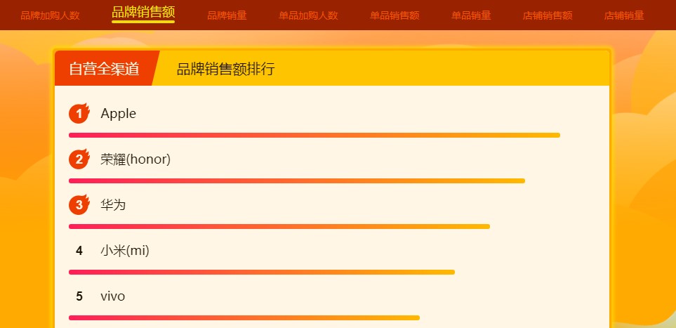 在手機方面,蘇寧悟空榜顯示,12小時裏,蘋果、榮耀、華為始終強勢,位列手機銷售額排行榜前三。