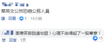 還有人稱,“蔡英文公然恐嚇公務人員”、“面帶笑容説這句話!心理不由得起了一股寒意”。