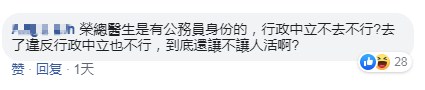有島內網友也表示,“榮總醫生是有公務員身份的,行政中立不去不行?去了違反行政中立也不行,到底還讓不讓人活啊?”