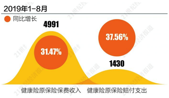 另據國家統計局數據顯示,2019年前三季度,國內保險公司預計利潤總額達2856億元。而就水滴保險商城專注的健康險賽道而言,銀保監會披露,2019年1-8月健康險原保險保費收入達4991億元。