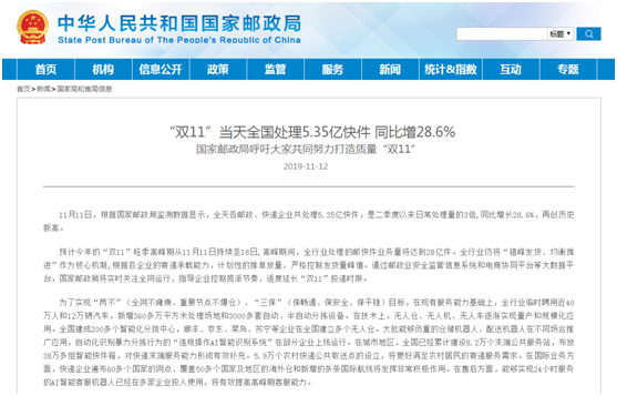 國家郵政局:“雙11”當天全國處理5.35億快件