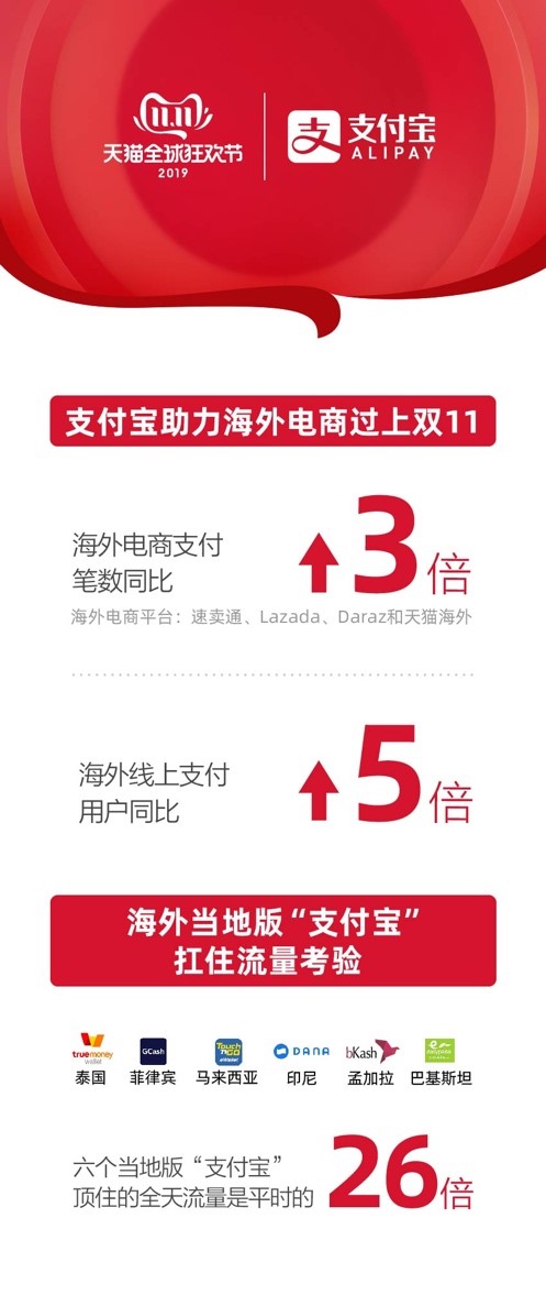 有超過220個國家和地區的消費者,都能上速賣通、Lazada、Daraz和天貓海外等主流海外電商平台來玩轉雙11。2019雙11全天,支付寶技術保駕護航助力海外電商集體過雙11,支付筆數同比增長了3倍,海外線上支付用户量同比增5倍。