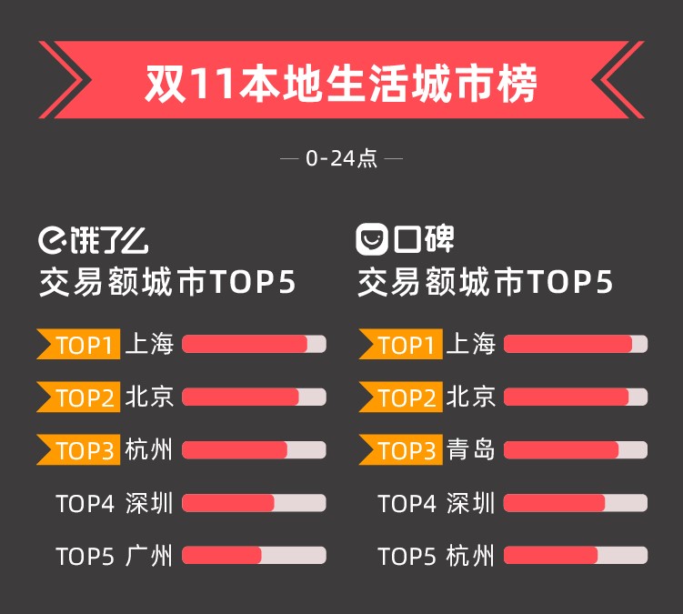 數據顯示,餓了麼交易額城市top5榜單,被“上北杭深廣”五城用户包攬了;口碑交易額top5城市為上海、北京、青島、深圳和杭州。杭州消費者買走超19000對雞翅獲封雙11“炸雞之城”,上海用户消費超20000單洗浴套餐成“桑拿之城”;小城青年正在成為本地生活行業“深度用户”,數據顯示,黑龍江五常市用户雙11商超零食訂單同比增長260%,浙江省德清縣水果訂單同比增長173%。