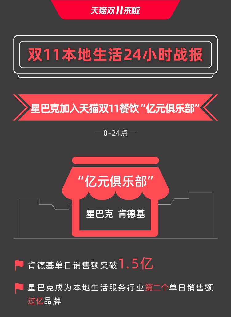 “吃貨們”還一舉吃出本地生活行業首個“億元俱樂部”成員,11日上午8點29分,口碑餓了麼宣佈,肯德基在天貓雙11的銷售額突破1億元,肯德基24小時最終銷售額最終超1.5億元。11日21:23,第二個“億元户”出現,星巴克成為本地生活行業又一個單日銷售額過億的餐飲品牌。