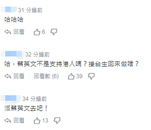 由於蔡英文當局此前曾多次拿香港局勢説事,有網友對其此次接回台生的行為諷刺稱:“不是要聲援香港嗎,怎麼可以撤走,應該把民進黨青年軍全部送過去啊。”“真沒種,噗。”