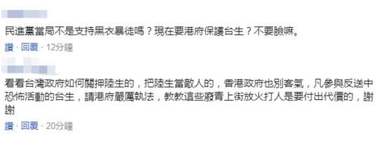 不過,對此説法,也有島內網友批評:“*民進黨當局不是支持黑衣暴徒嗎?*現在要港府保護台生?不要臉嘛。”